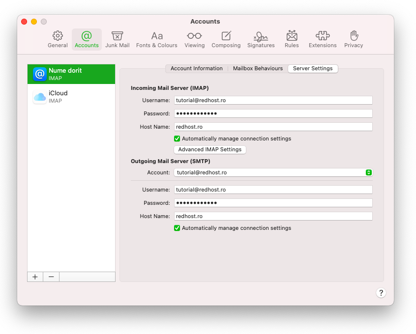 Acest pas nu este necesar dar astfel puteti verifica daca setarile sunt corect facute (cu exceptia parolei care este mascata). Din meniul superior apasati "Mail", apoi "Preferences...", alegeti contul dorit (daca aveti mai multe) si apasati tab-ul "Server settings". Va reamintim ca acolo unde scrie redhost.ro trebuie sa fie setat numele dvs de domeniu si acolo unde apare adresa de mail tutorial@redhost.ro trebuie sa aveti adresa dvs de mail. In general este indicat sa lasati bifate cele 2 optiuni "Automatically manage connection settings".
