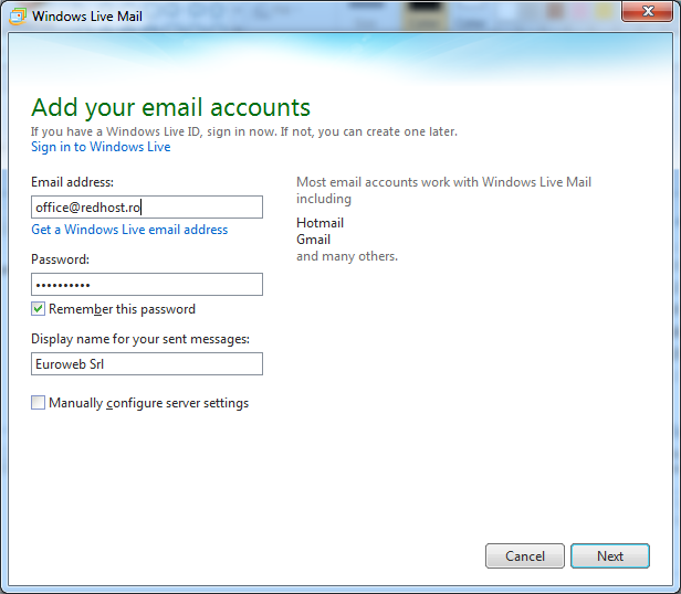 Dupa ce ati creat adresa Dvs de mail in cPanel o puteti configura in Windows Live Mail. Nu configurati Live Mail inainte de a crea adresa de mail in cPanel.